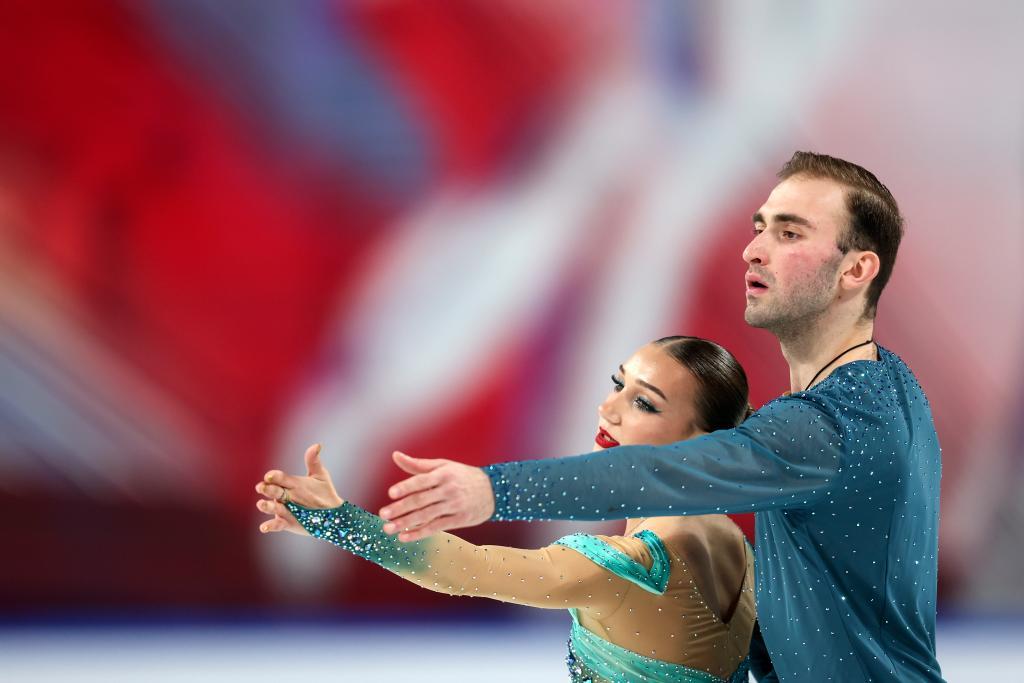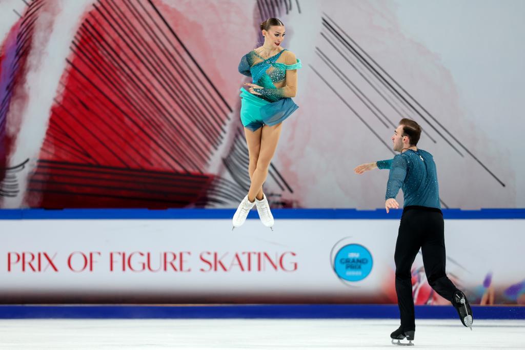 10月25日,格鲁吉亚组合阿纳斯塔西娅·梅特尔基娜(右)/卢卡·别鲁拉瓦在自由滑比赛中。最终,他们夺得双人滑比赛冠军。