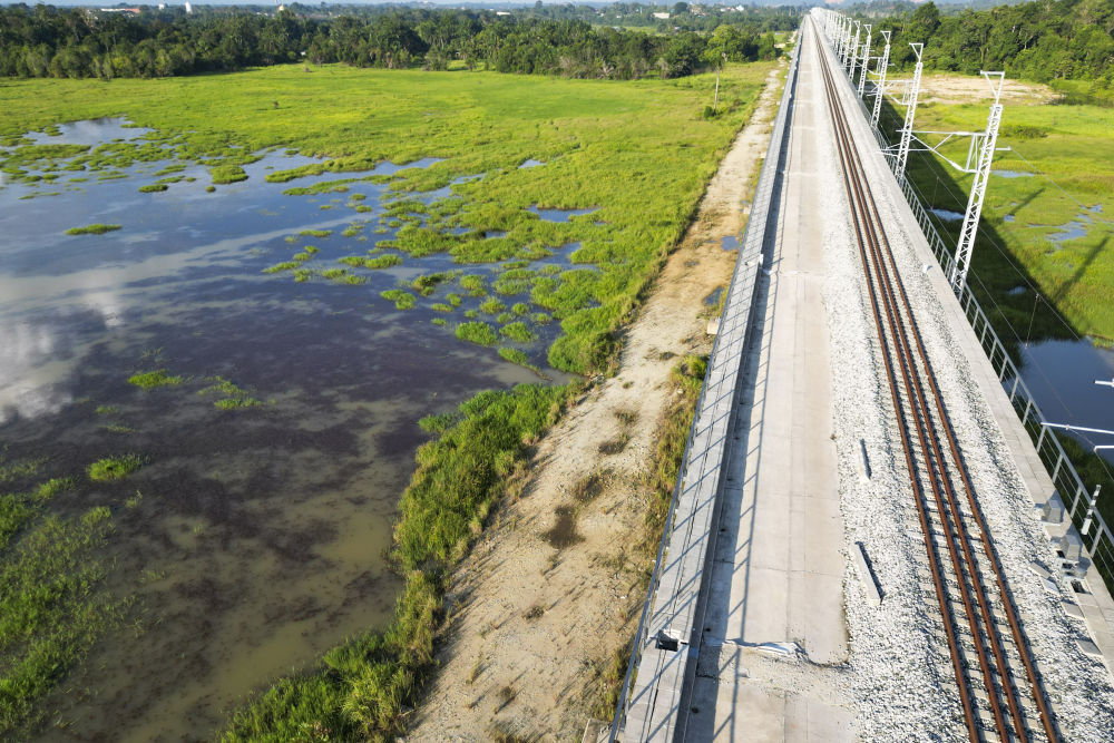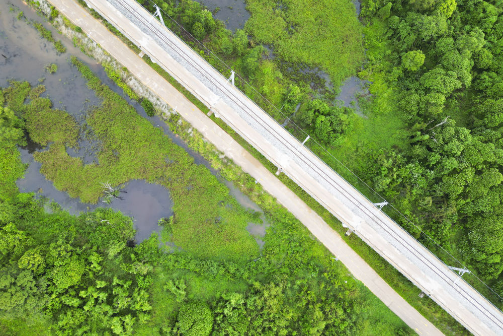 ↑10月9日,在马来西亚彭亨州,马东铁轨道穿越一片湿地(无人机照片)。