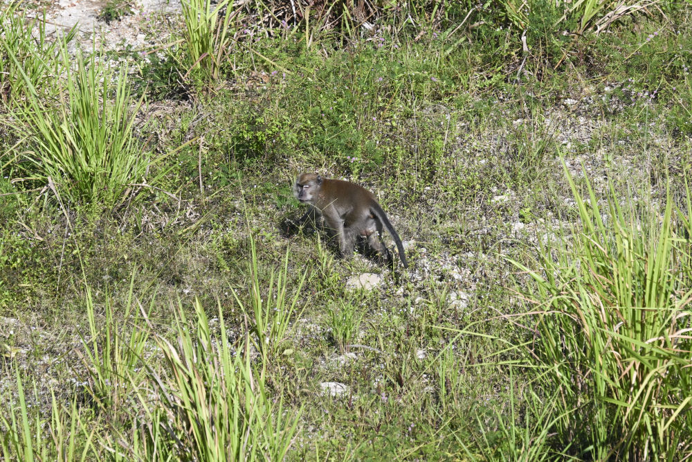 ↑10月10日,在马来西亚彭亨州,一只猴子从马东铁项目的一处桥洞下穿过。