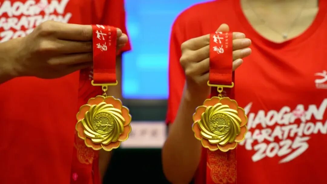 在奖牌、服装设计方面,奖牌以粉色为底嵌入孝感董永七仙女雕塑标志性元素,中间设3D浮雕可旋转装置增强立体感,背面以市花为底雕金色繁花;参赛服选用象征热情活力的红色,寓意孝感以赤诚迎跑者,采用吸汗透气优质面料,正面印蒙牛2025孝感马拉松赛事LOGO及手写英文,背面展示“孝爱之城,甜蜜之地”赛事口号,尽显城市特色与赛事温度。
