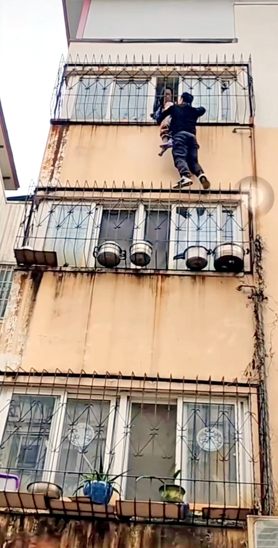 据多名网友拍摄的视频显示,一名小男孩悬吊在四楼的防盗网上,窗内有人在拉,男孩的上衣都被拉到了顶部,整个上身都赤裸着,情形十分危急。一名黑衣男子通过外墙上的防盗网,从一楼艰难地爬到了三楼,然后托举男童,将其送回窗内。目击者宋女士介绍,救人者是一名外卖小哥,他救完孩子下来时,整个人都是瘫软的,身体都在颤抖,真是个“平民英雄”!
