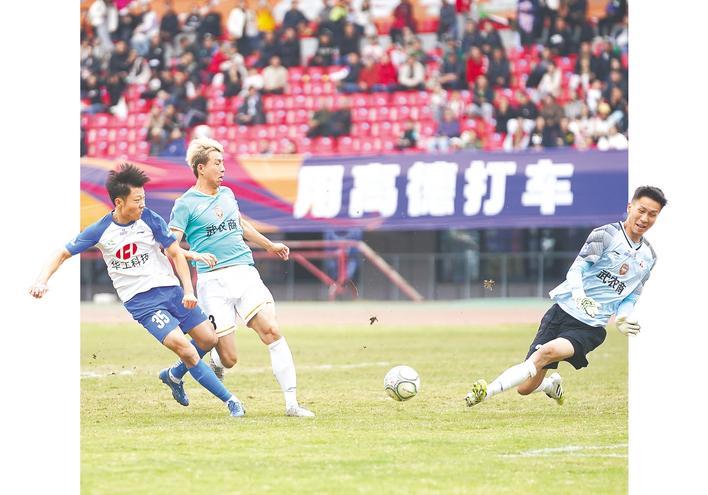 10月26日下午,在武汉市城市足球超级联赛(城区组)焦点战中,东湖高新区队在主场2比1逆转击败江岸区队,以全胜战绩提前锁定汉超城区组冠军。(湖北日报全媒记者 魏铼 摄)