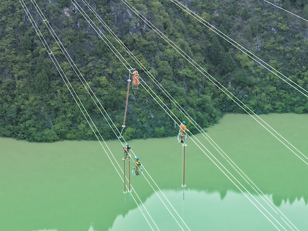10月22日,在汉江郧阳区青山镇琵琶滩村段,国网十堰供电公司电力工人脚踩飞车装置、身系安全绳、手持扳手在高空输电线路上安装线路附件。该线路计划于11月底投产送电,届时将为西武高铁湖北段箭流铺、东河牵引站提供可靠的电力保障。通讯员郝金鑫摄