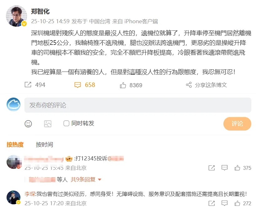 10月25日下午,歌手郑智化在微博发文,称深圳机场对残疾人的态度没人性,升降车离机门地板25公分,他的轮椅推不进飞机,腿也跨不进机舱门,操纵升降车的司机完全不愿把升降板提高,冷眼看着他连滚带爬进飞机。
