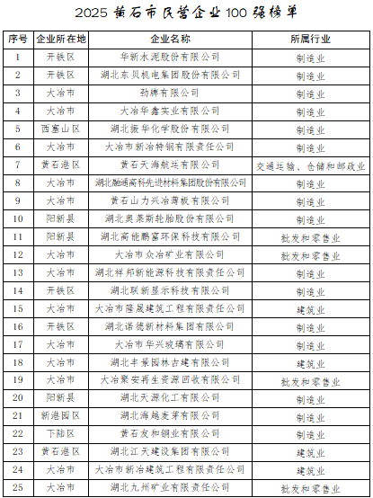 荆楚网(湖北日报网)讯(记者 阮琼 通讯员 刘季)10月27日,黄石市召开新闻发布会发布“2025黄石市民营企业100强”名单。