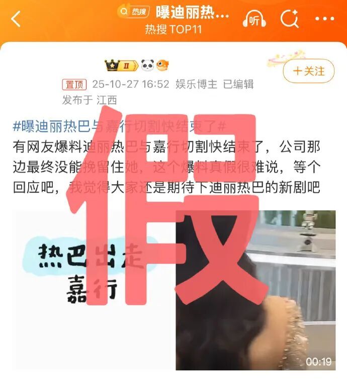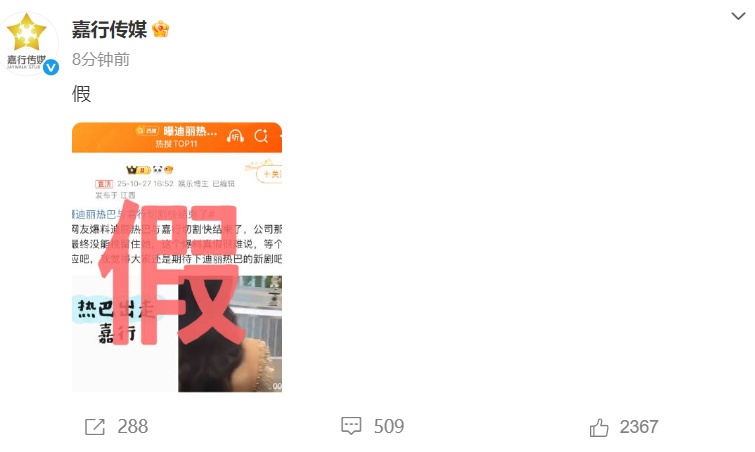 10月27日,嘉行传媒发文否认“与迪丽热巴切割快结束了”。