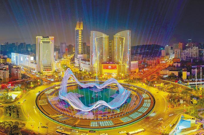 武汉光谷广场地标“星河”雕塑灯光璀璨,象征中国光谷独树一帜,光耀全球。(湖北日报全媒记者 魏铼 摄)