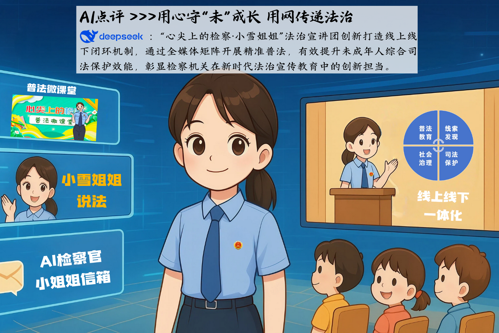 据悉,“心尖上的检察·小雪姐姐”法治宣讲团是湖北省人民检察院深化未成年人综合司法保护而精心打造的法治宣传品牌,团队历经十余年发展,已成为涵盖全省各级检察院从事未成年人检察工作的248名干警及来自各行各业的258名志愿者的未成年人综合司法保护工作队伍。宣讲团积极适应信息化趋势,将主阵地从线下转移到线上,构建了以系列普法微课堂、短视频、AI智能信箱为核心的网络普法矩阵,实现了普法模式从“面对面”到“键对键”的升级。通过网络平台精准捕捉未成年人的法治需求,形成了“普法教育—线索发现—司法保护—社会治理”的线上线下一体化工作闭环。