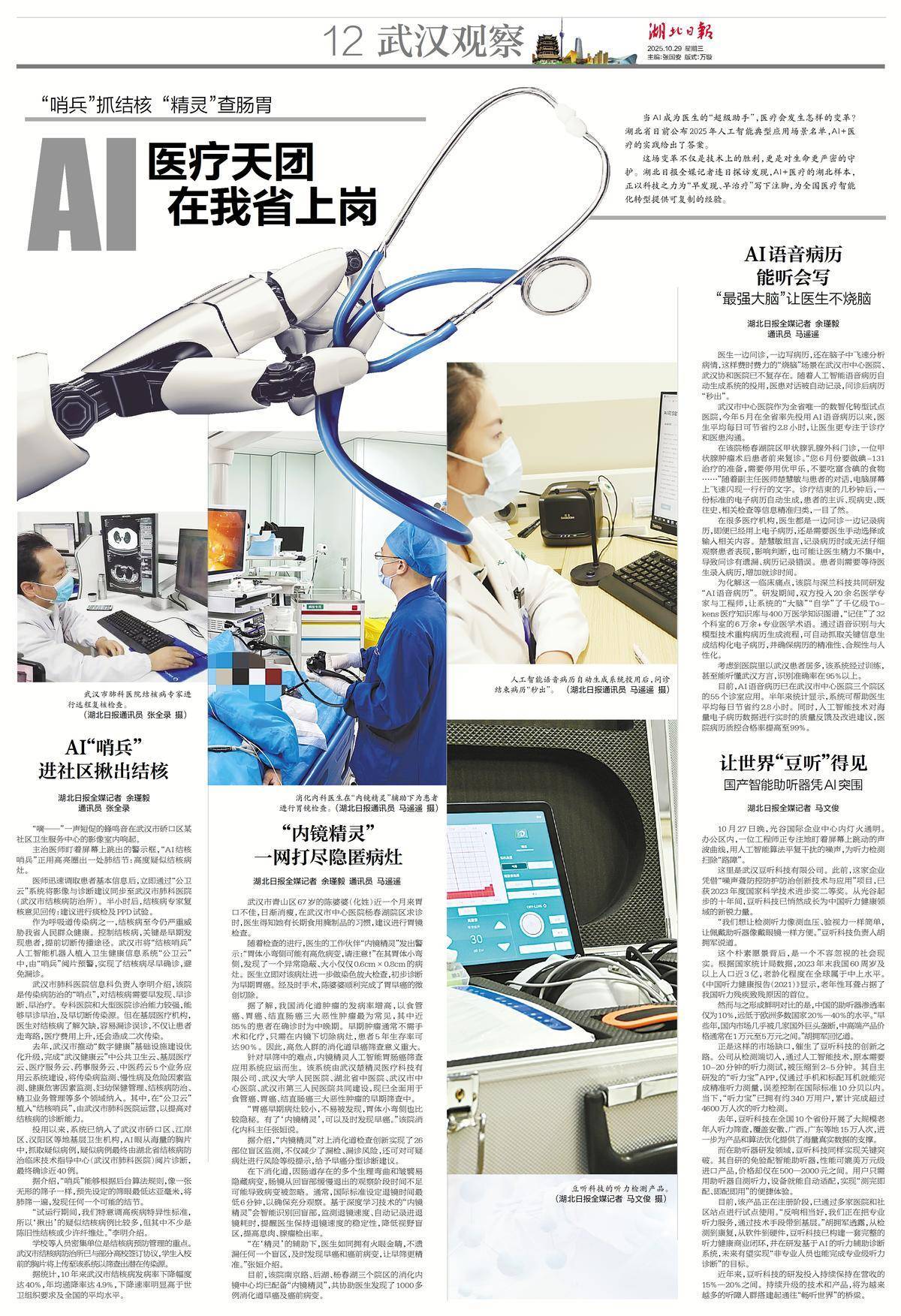 这场变革不仅是技术上的胜利,更是对生命更严密的守护。湖北日报全媒记者连日探访发现,AI+医疗的湖北样本,正以科技之力为“早发现、早治疗”写下注脚,为全国医疗智能化转型提供可复制的经验。
