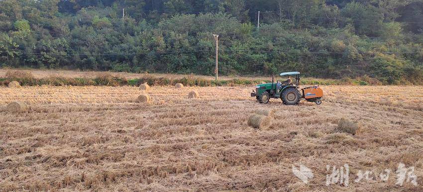 湖北日报客户端讯(通讯员杜寒梅)在大悟阳平镇一片刚完成收割的稻田里,几台打捆机正开足马力作业,随着机器驶过田间,残留的水稻秸秆被清理捡拾起来收进机器尾部容器内,再挤压捆扎后变成一个个结结实实的“金卷卷”从机器里“吐”出来。