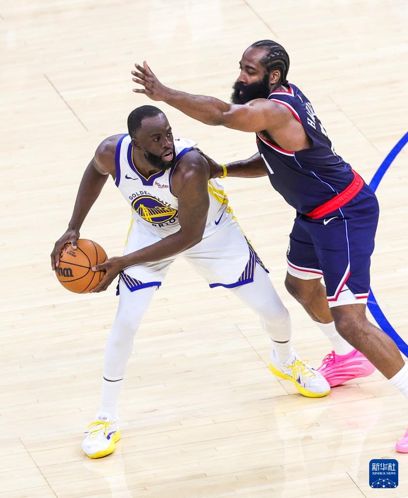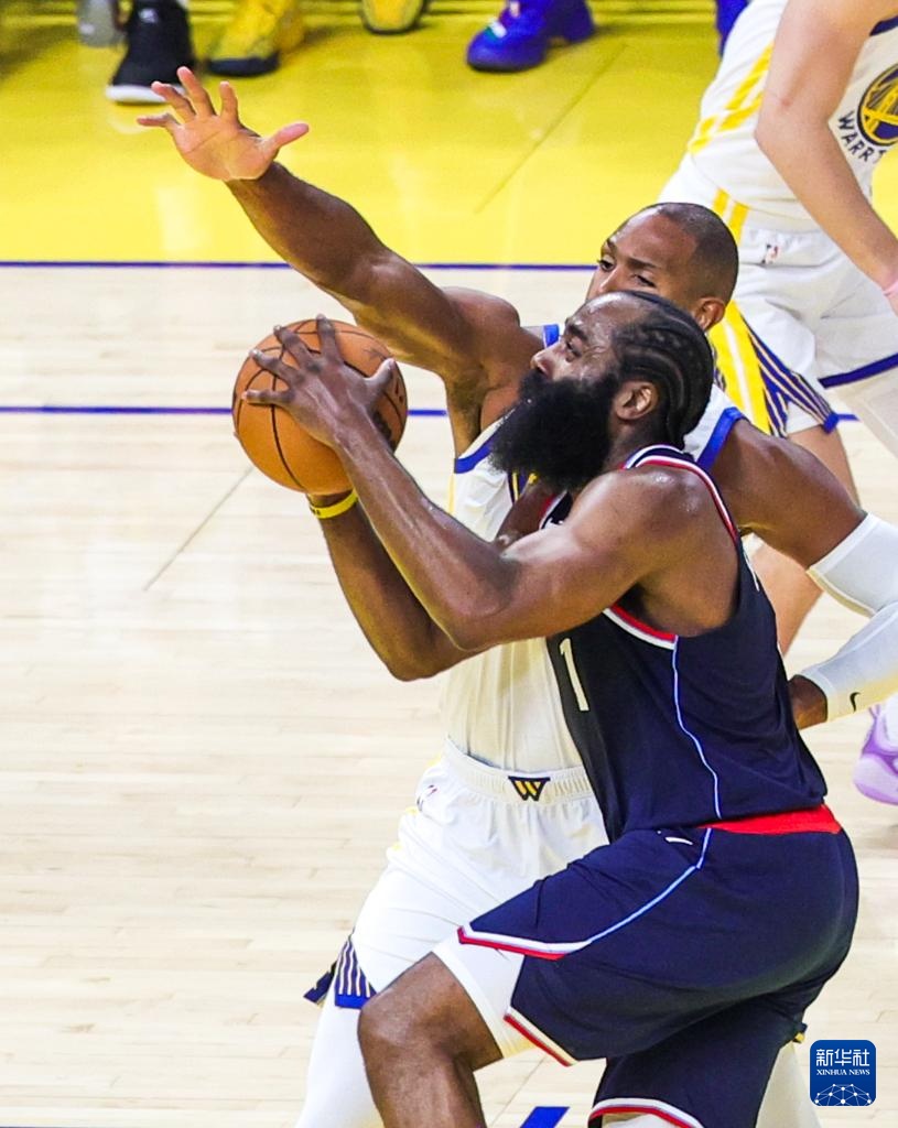 10月28日,快船队球员哈登(右)在比赛中防守勇士队球员格林。