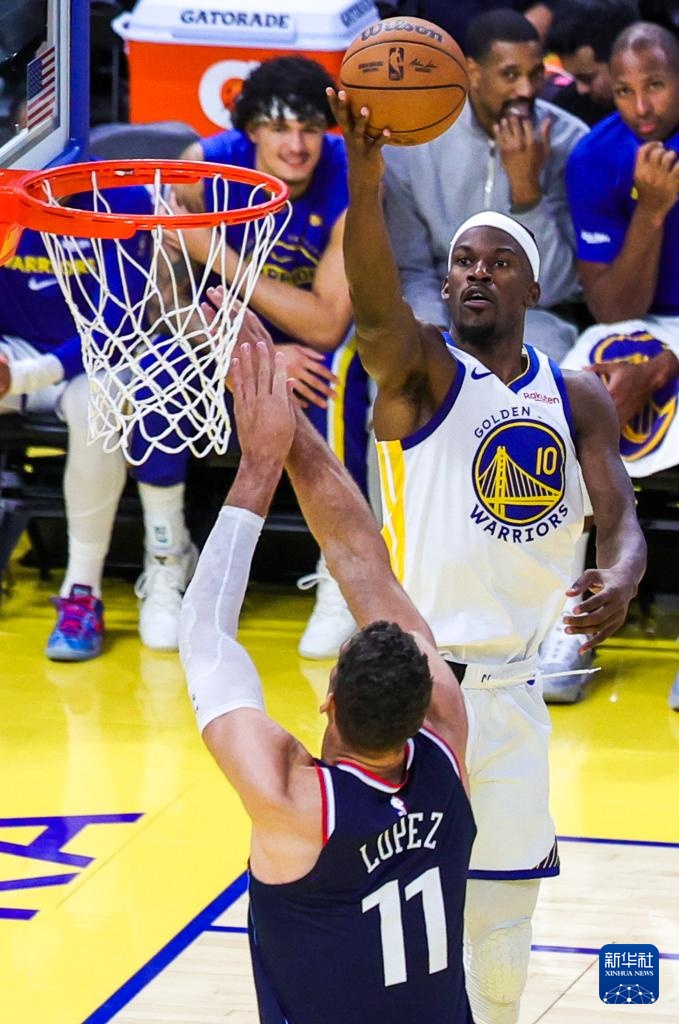 10月28日,勇士队球员吉米·巴特勒三世(右)在比赛中上篮。