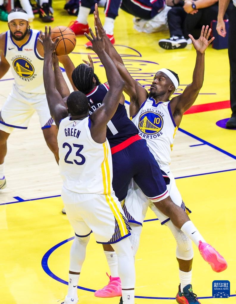 10月28日,勇士队球员吉米·巴特勒三世(右一)、格林(前左)在比赛中防守快船队球员哈登。
