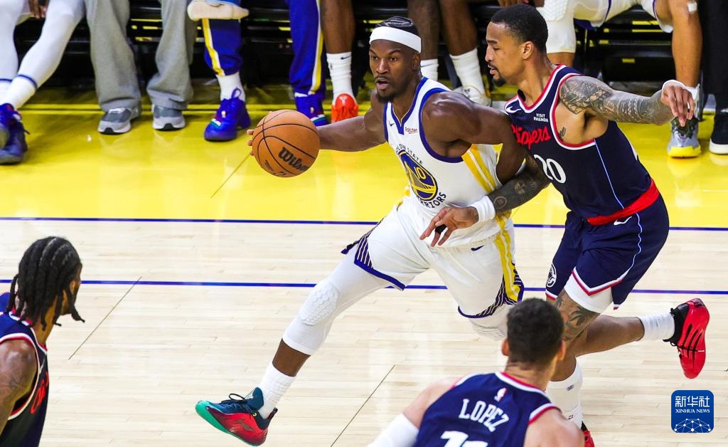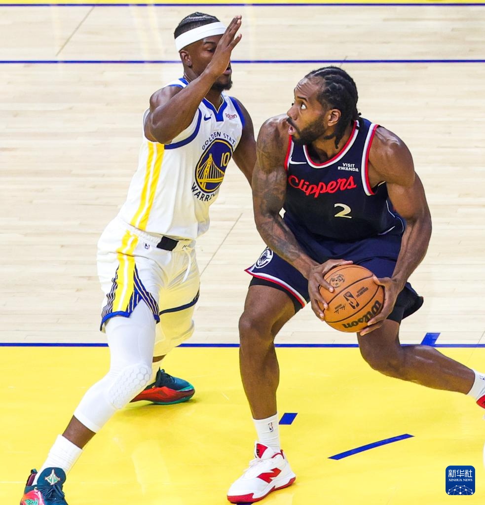 10月28日,快船队球员伦纳德(右)在比赛中带球突破勇士队球员吉米·巴特勒三世的防守。