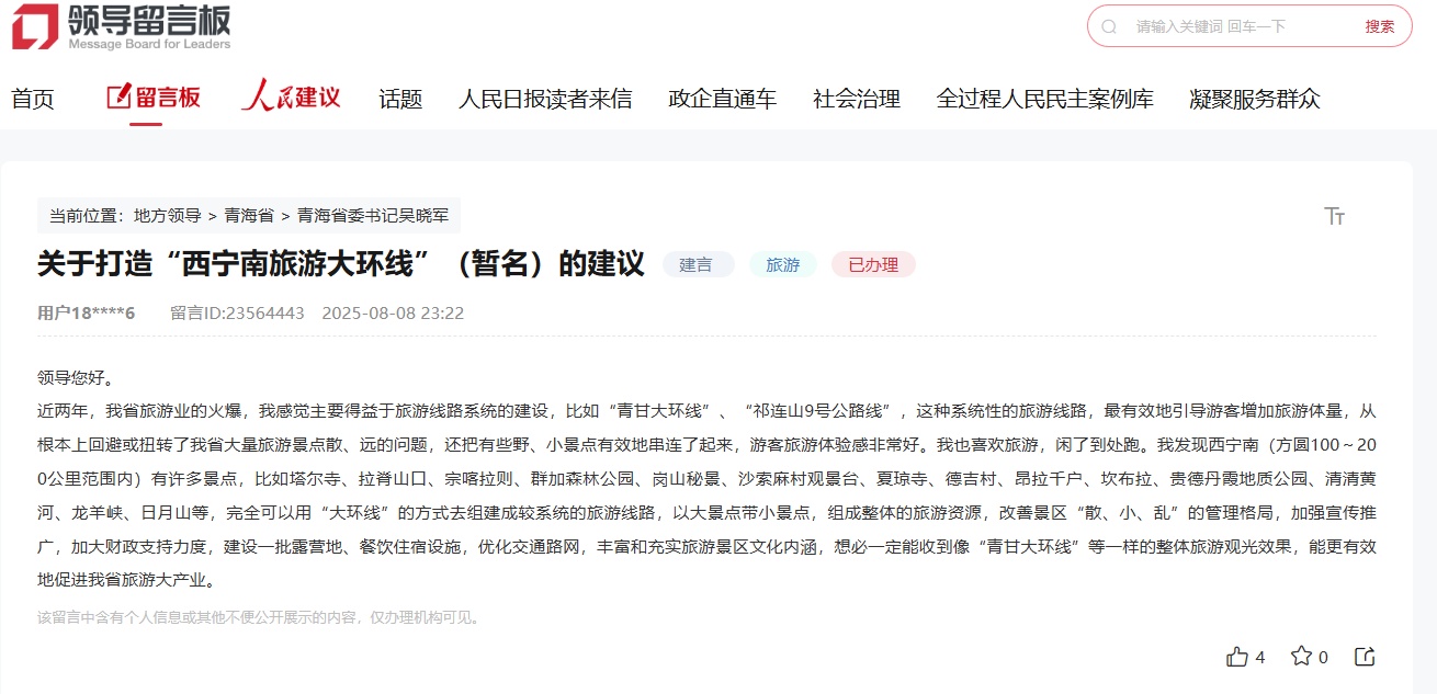 近日,有群众在人民网“领导留言板”留言建议青海打造西宁南旅游大环线。该群众建议,西宁南(方圆100至200公里范围内)有许多景点,比如塔尔寺、拉脊山口、宗喀拉则、群加国家森林公园、岗山秘景、沙索麻村观景台、夏琼寺、德吉村、昂拉千户、坎布拉世界地质公园、贵德地质公园、清清黄河、龙羊峡、日月山等,完全可以用“大环线”的方式去组建成较系统的旅游线路,以大景点带小景点,组成整体的旅游资源,优化景区“散、小、乱”的格局,加强宣传推广,加大财政支持力度,建设一批露营地、餐饮住宿设施,优化交通路网,丰富和充实旅游景区文化内涵,定能收到像“青甘大环线”等一样的整体旅游观光效果,能更有效地促进青海旅游产业发展。