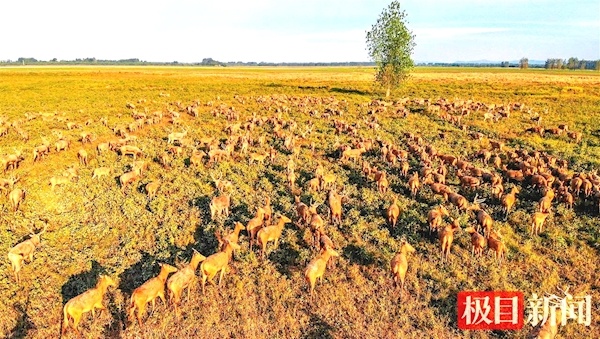 呦呦鹿鸣,食野之苹。深秋霜降,在湖北石首麋鹿国家级自然保护区,4500余头麋鹿徜徉在长江故道,它们或悠然觅食,或戏水嬉闹,好一幅和谐的生态画卷。