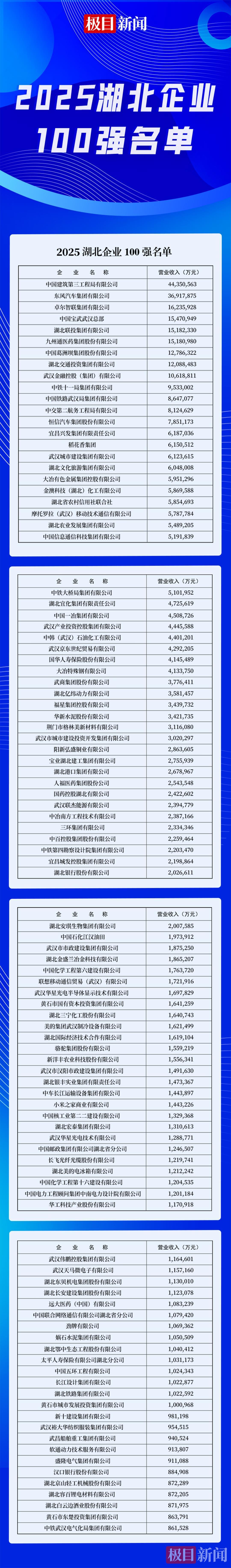 2025湖北企业三项100强榜单,遵循国际通行的惯例,以企业上年度营业(销售)收入为入围标准,根据企业自愿申报并经审计的各项指标数据,由湖北省企联湖北企业三项100强分析发布活动办公室调研、审核、分析,报湖北省企联湖北企业三项100强分析发布活动领导小组审定,并报湖北省国资委后产生。