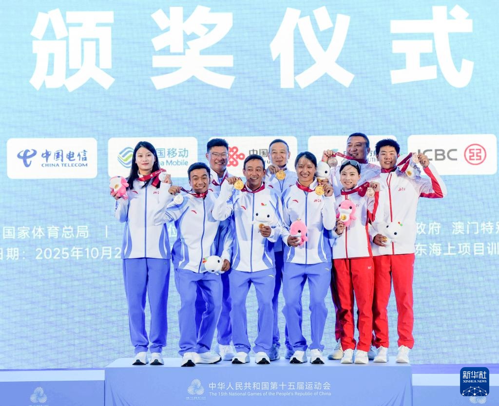 10月29日,冠军浙江队选手徐臧军(左四)/徐娅妮(右四)、亚军浙江队选手徐建勇(左二)/肖海伦(左一)、季军内蒙古队选手王兰心(右三)/王晶(右一)在混合470级颁奖仪式上与教练合影。
