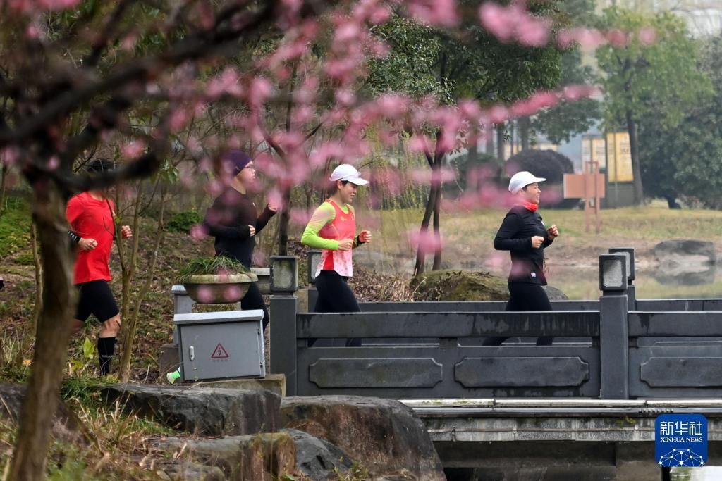 2023年3月1日,跑步爱好者在浙江省宁波市奉化区仁湖公园晨跑。新华社记者黄宗治摄