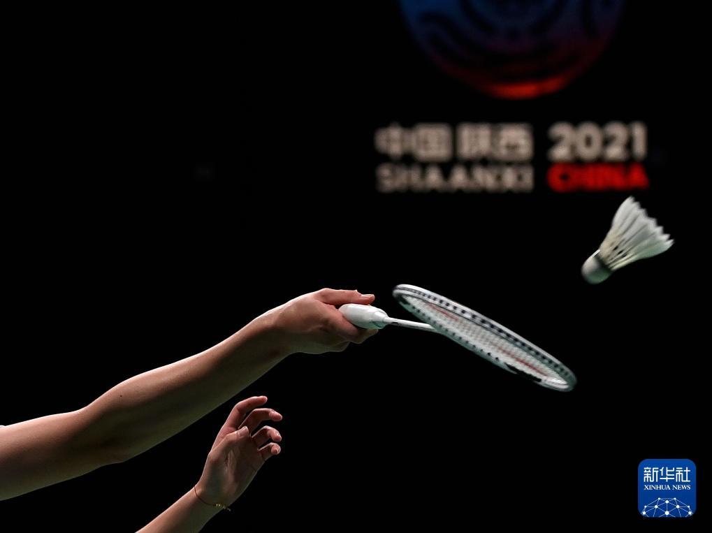2021年9月17日,浙江队选手陈雨菲在比赛中回球。当日,在西安举行的第十四届全运会羽毛球女子单打决赛中,浙江队选手陈雨菲以2比0战胜江苏队选手何冰娇,获得冠军。新华社记者刘潇摄