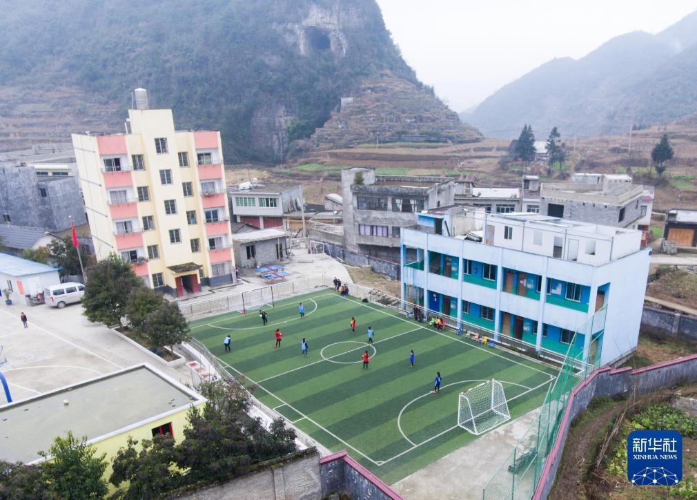 2020年1月2日,在贵州省毕节市大方县对江镇元宝小学,孩子们在进行足球比赛。新华社发(罗大富摄)