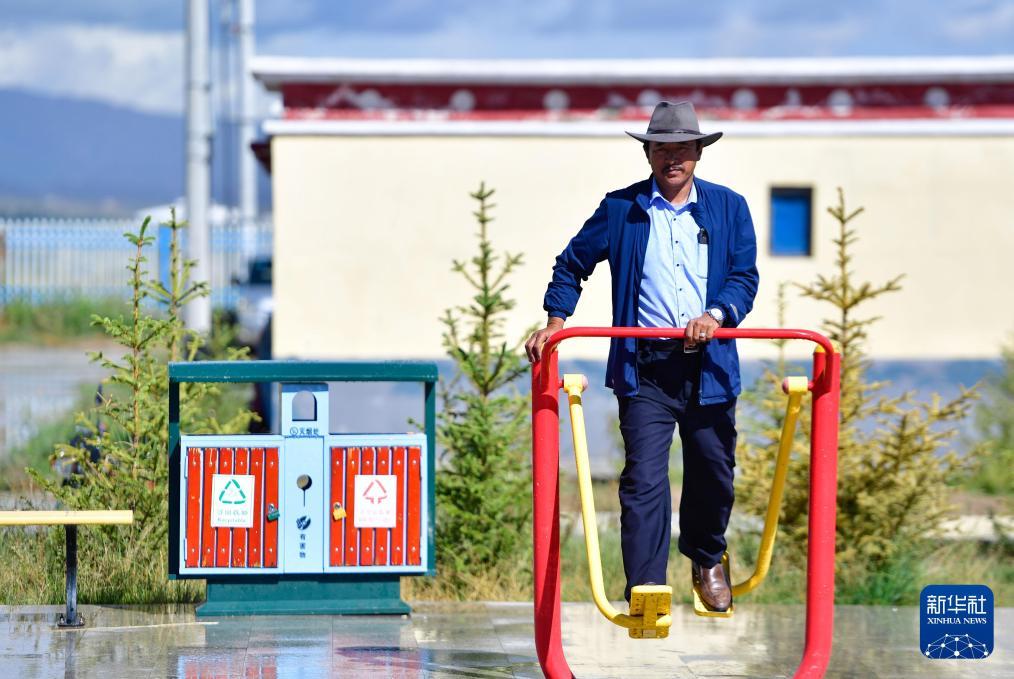 在青海省海南藏族自治州共和县廿地乡切扎村,村民在村里休闲健身(2020年8月17日摄)。新华社记者张龙摄