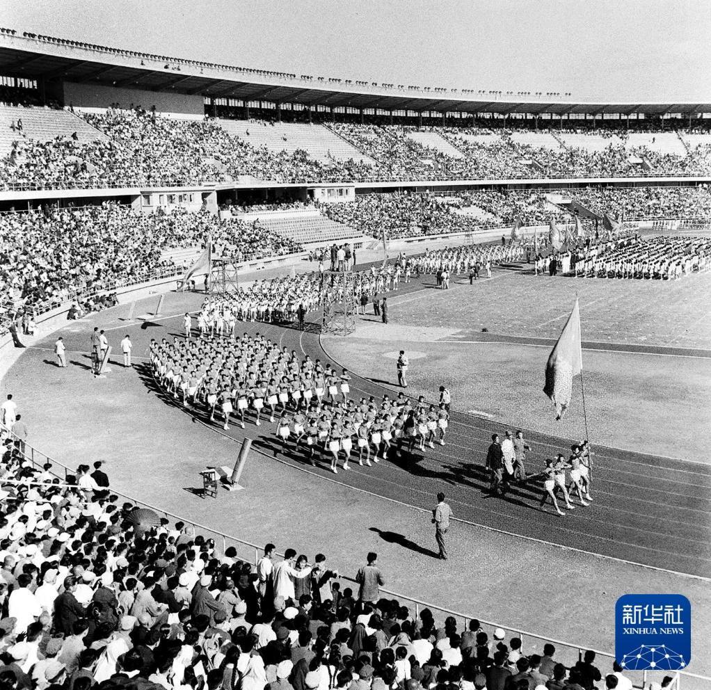 1959年9月13日,运动员在北京工人体育场举行的首届全运会开幕式上列队步入会场。新华社发