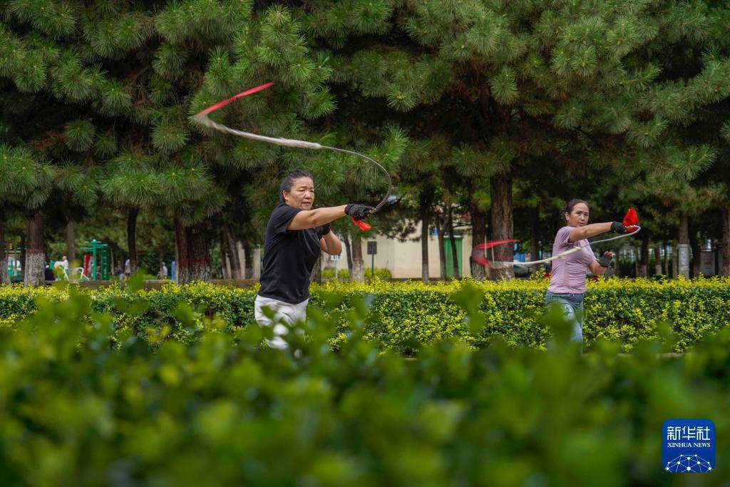2023年8月6日,市民在河北省遵化市人民公园练习健身鞭。新华社发(刘满仓摄)