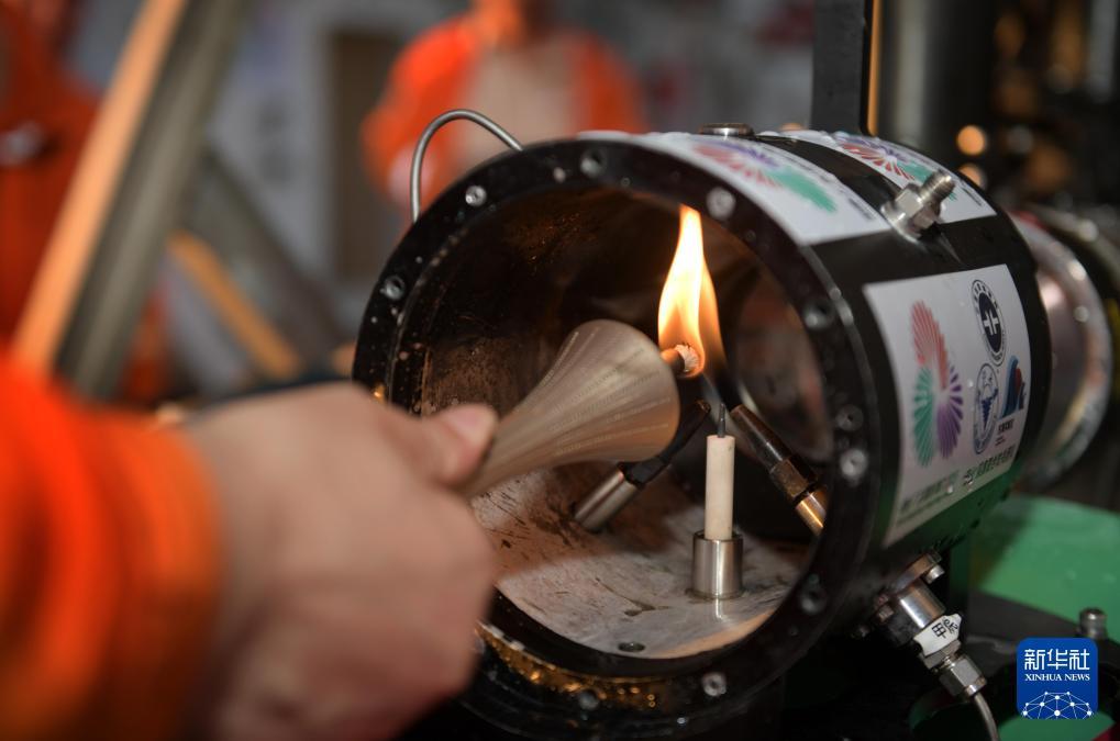 在科考船甲板面,工作人员从搭载在“海马”号深海遥控潜水器上的采火装置里取火(2025年9月18日摄)。新华社记者卢汉欣摄
