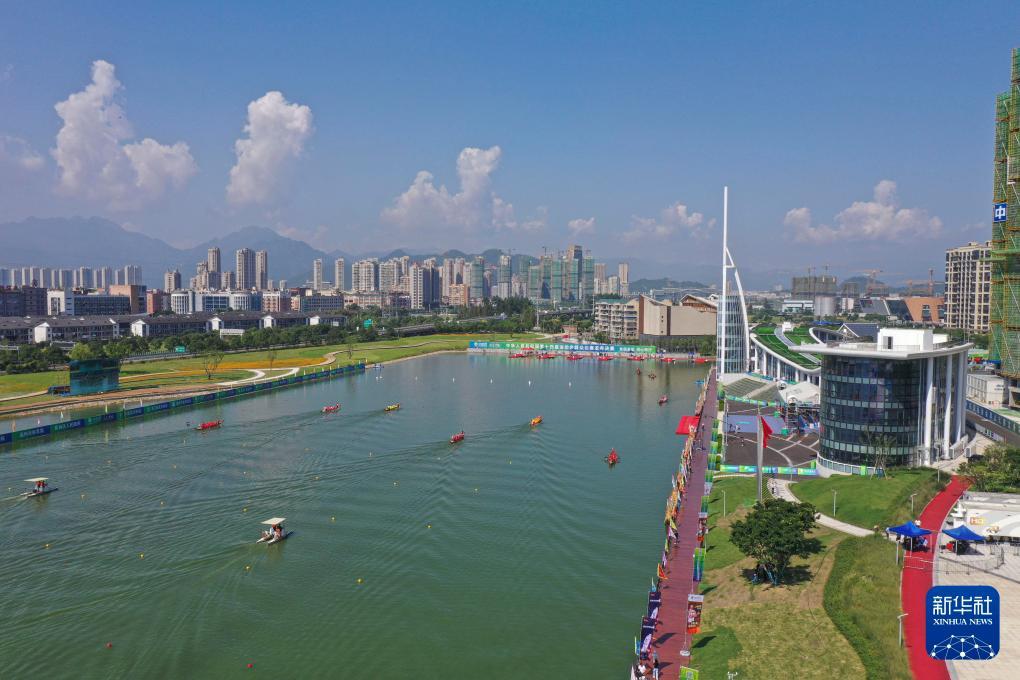 2021年9月22日,在浙江温州拍摄的第十四届全运会群众比赛龙舟决赛现场。新华社发(苏巧将摄)