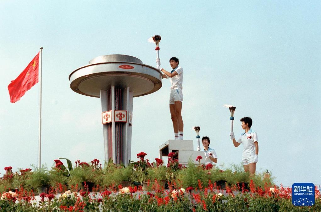 第五届全国运动会于1983年9月18日至10日1日在上海举行,这是著名运动员朱建华、曹燕华、张爱玲(从左至右)登上巨型火炬台准备引燃主火炬。新华社记者官天一摄