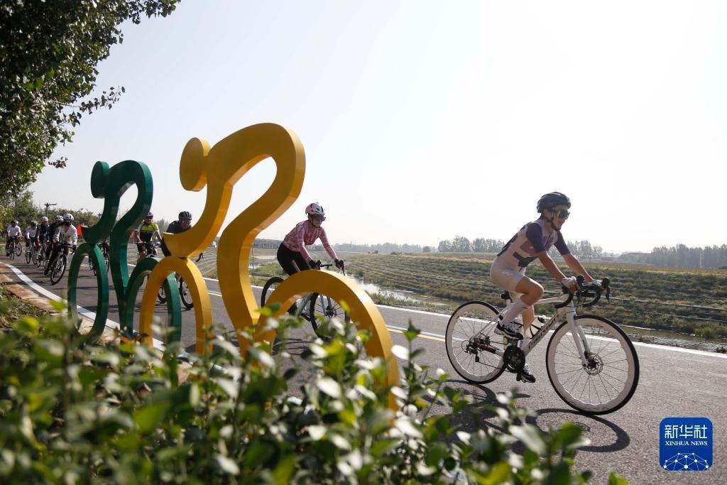 2025年9月30日,在河北省邢台市高新区举行的骑行迎国庆活动中,骑行爱好者在祝村镇牛尾河畔骑行。新华社发(张驰摄)