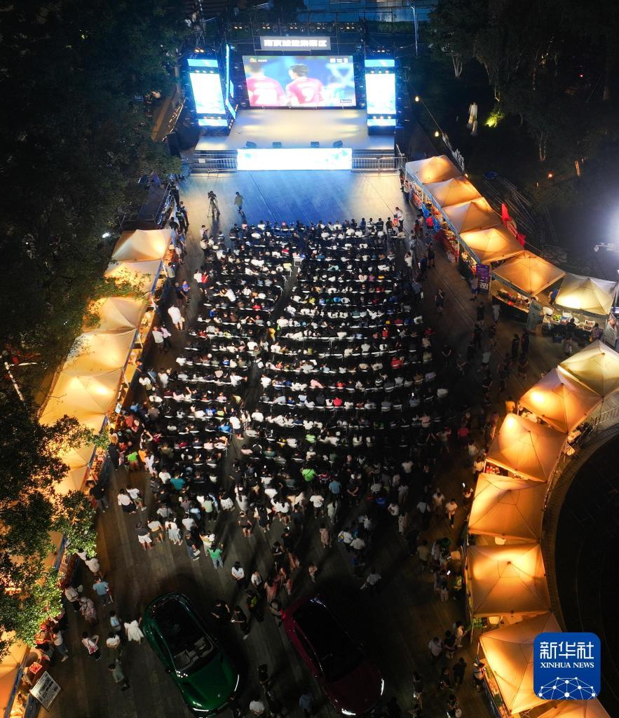 2025年8月17日,球迷在南京一个露天屏幕前观看2025江苏省城市足球联赛(“苏超”)第九轮比赛。新华社记者季春鹏摄