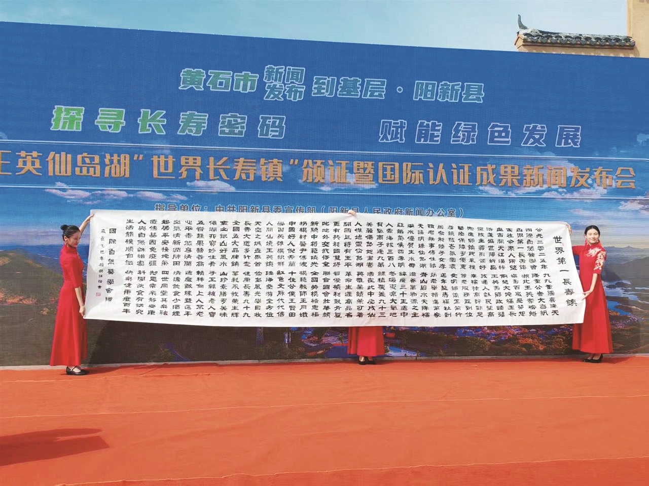 “‘王英仙岛湖’荣膺全球首个‘世界长寿镇’!”10月29日上午,在湖北黄石市阳新县王英镇仙岛湖景区,国际自然医学会代表理事、执行会长,世界长寿乡科学认证委员会常务副主席(兼中国总部主任)王智墨宣布,阳新县王英仙岛湖以其卓越的生态禀赋与人文传承,经专家评审,获得全球首个“世界长寿镇”殊荣。