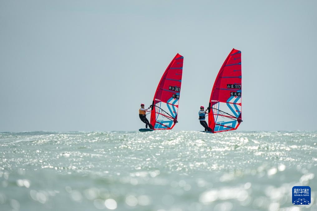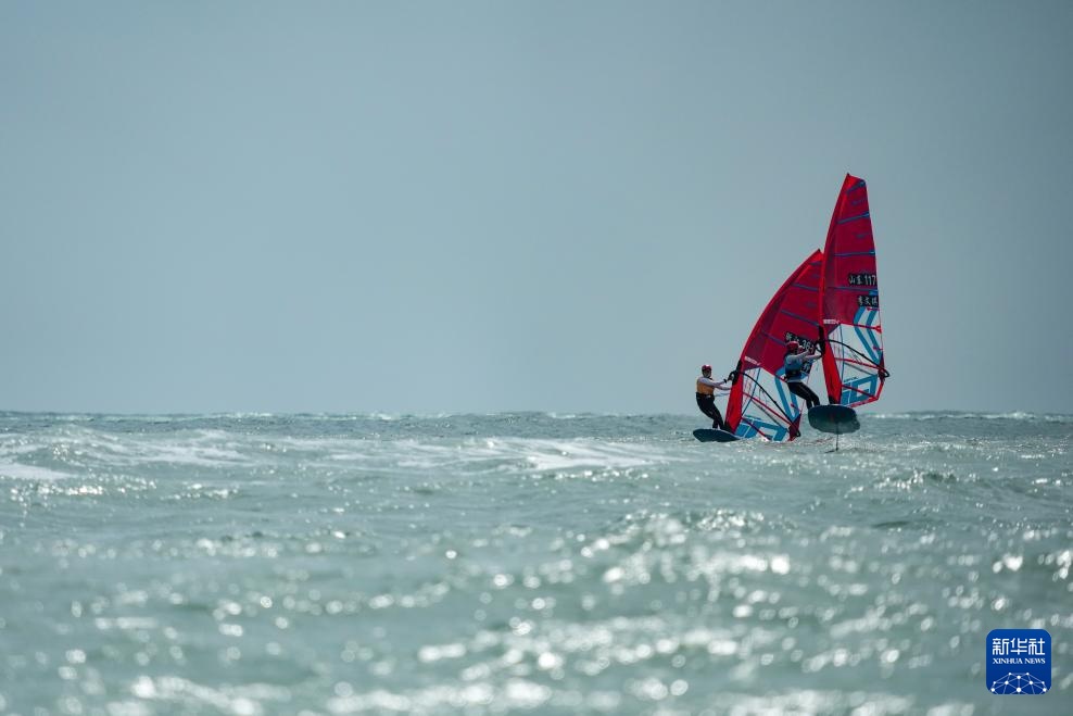 10月30日,浙江队选手闫铮(左)和山东队选手李文琪在女子水翼帆板级比赛中。最终,闫铮和李文琪分获冠军和季军。
