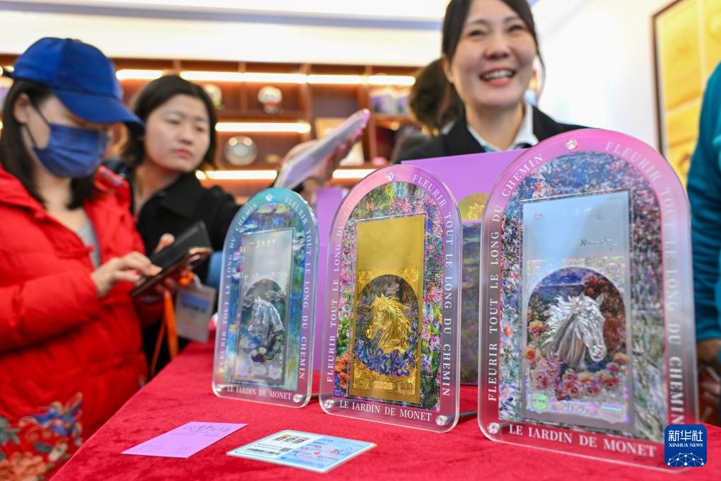 钱博会交通银行展台摆放的《以梦为马 为爱而生》艺术金套装(10月31日摄)。