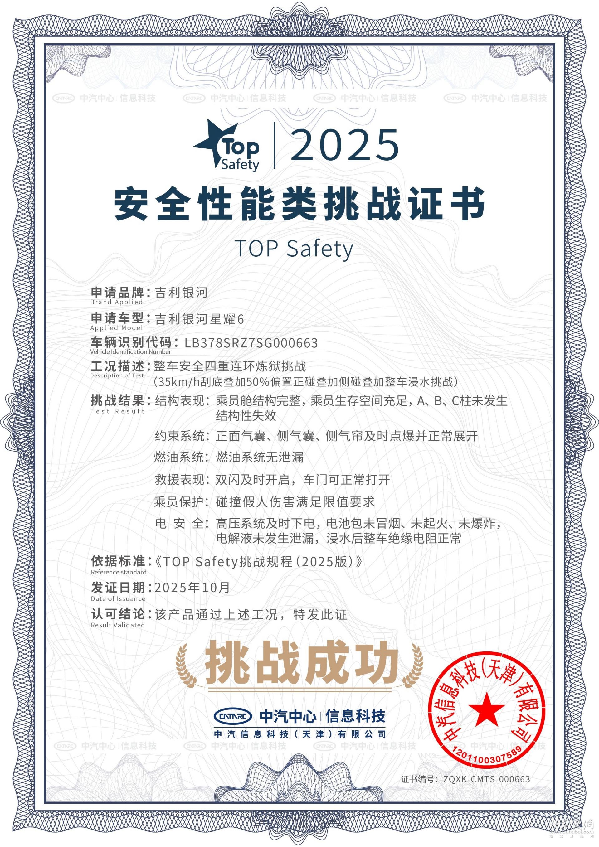 近期,吉利银河星耀6一次性通过中汽中心举办的行业首个超国标整车安全四重连环炼狱挑战,包括速度超现行标准16%的正面刮底碰撞、60km/h偏置正面碰撞、2.1倍国标能量的侧面碰撞及3倍国标深度的浸水测试,全面验证了从电池安全到车身结构稳定性的全维度安全实力,展现出在极端复合风险场景下的高安全冗余。