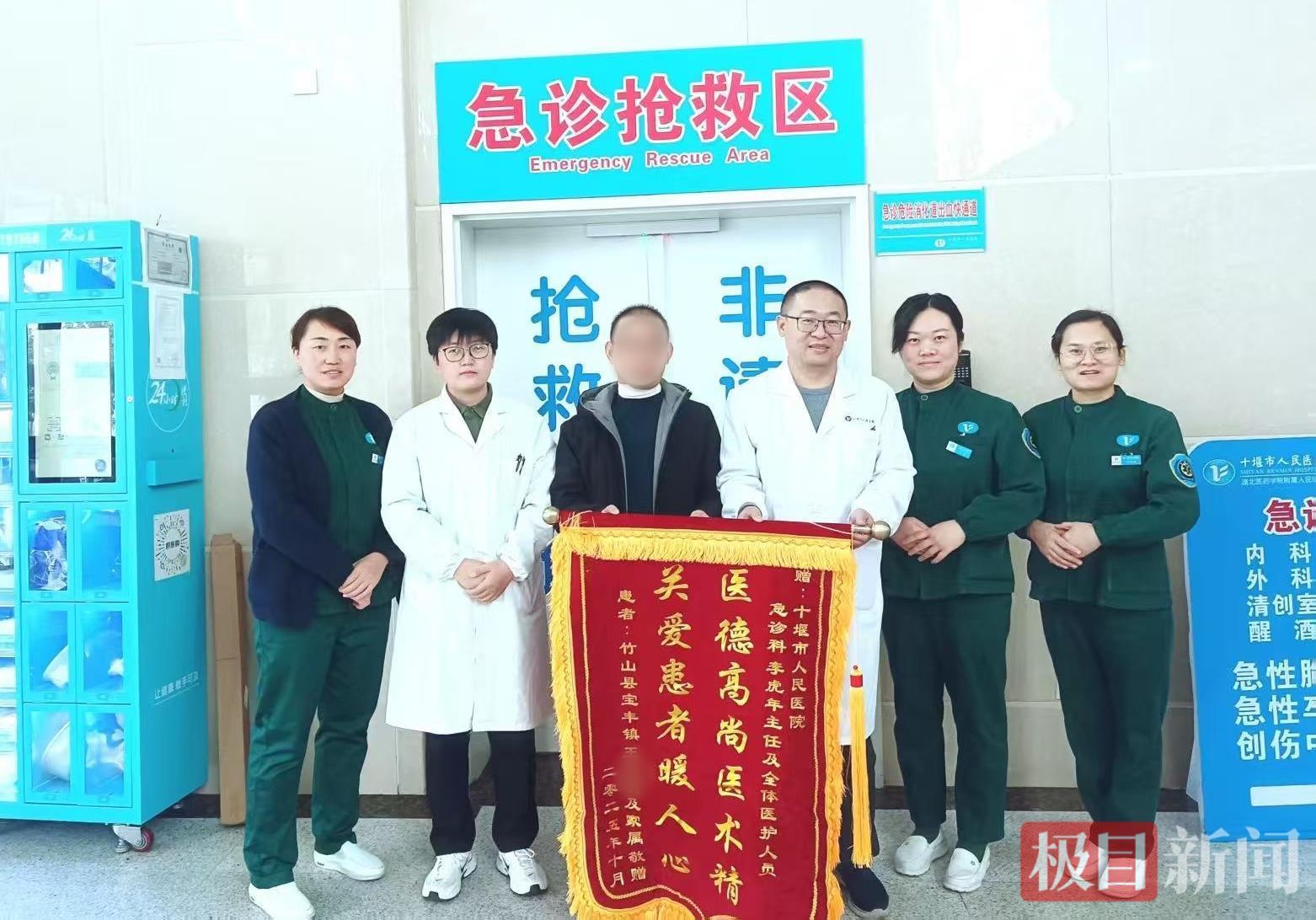 巡山时遭大量马蜂袭击,全身被蜇伤约40处,经湖北十堰市人民医院直升机紧急转运与急诊科团队全力抢救,最终转危为安。近日,康复出院后的王先生专程返回医院,将一面锦旗送至医护人员手中,以表达对该院高效救援和精准治疗的由衷感谢。