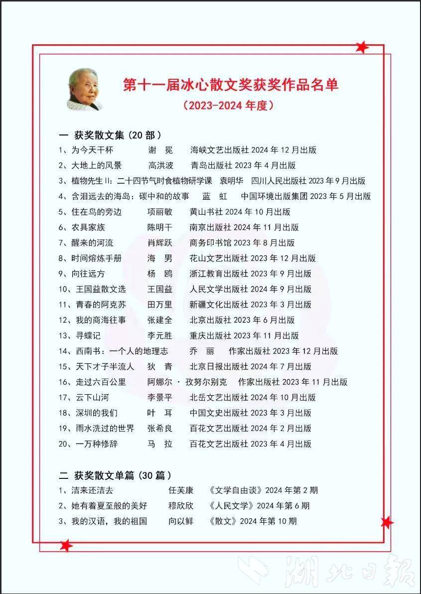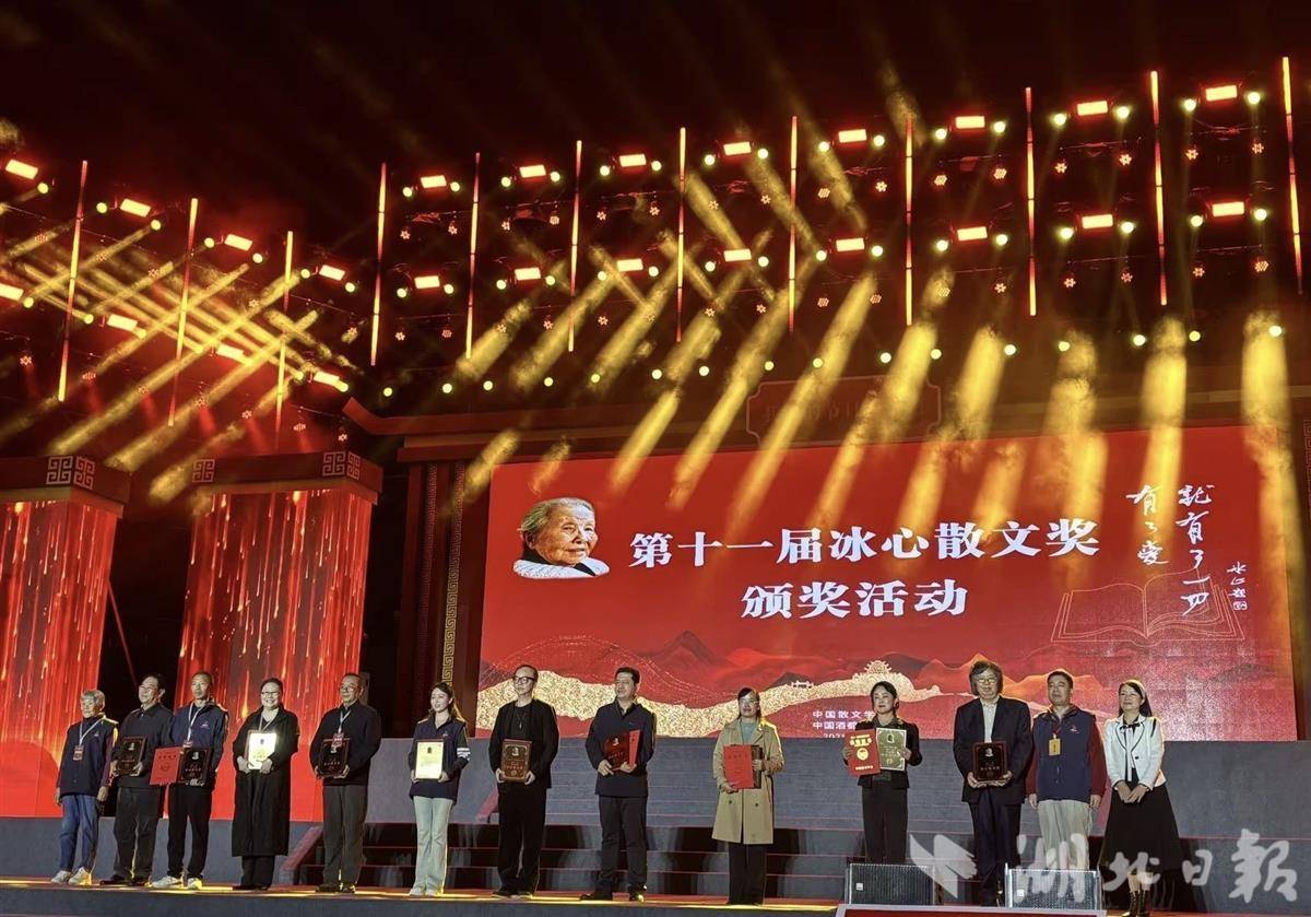 湖北日报讯(记者农新瑜、通讯员沈作)10月30日,中国散文权威奖项——第十一届冰心散文奖在贵州仁怀揭晓并举行颁奖典礼,20部作品获得散文集奖,30篇作品获得散文单篇奖,1部专著获散文理论奖。其中,湖北两位作家和多部作品获奖。