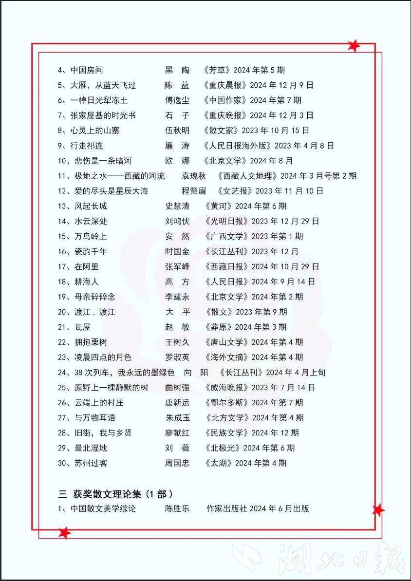 湖北作家陈胜乐以专著《中国散文美学综论》获得此次唯一一个散文理论奖,作家向阳以散文《38次列车,我永远的墨绿色》获散文单篇奖。此外,还有2篇由湖北文学刊物刊发的散文获奖,分别是刊于《长江丛刊》的《瓷韵千年》(作者:时国金)和刊于《芳草》的《中国房间》(作者:黑陶)。