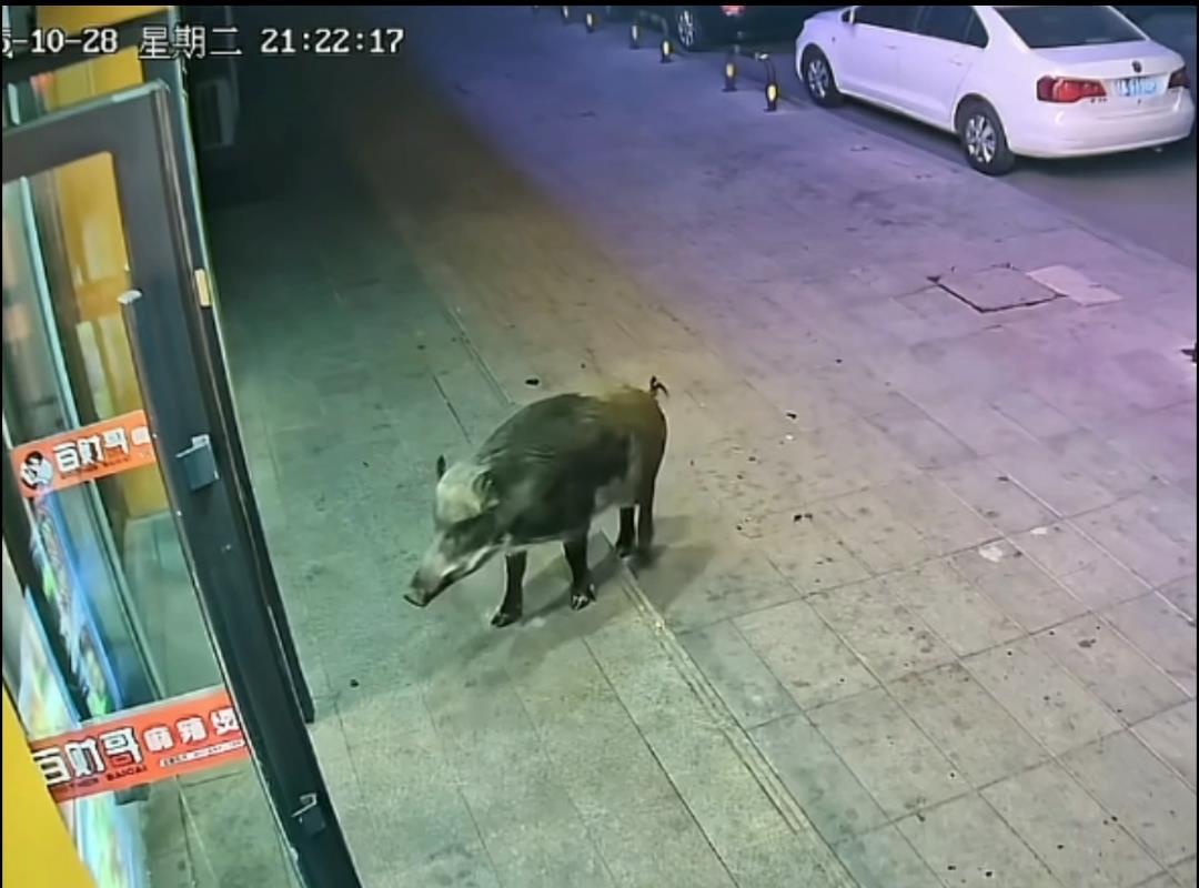 网友提供的门店监控视频显示,2025年10月28日21时22分,一头野猪在路边东张西望后,一头撞上旁边的玻璃门。视频中,玻璃门被撞击后发生抖动,随后野猪逃走并消失在黑夜中。