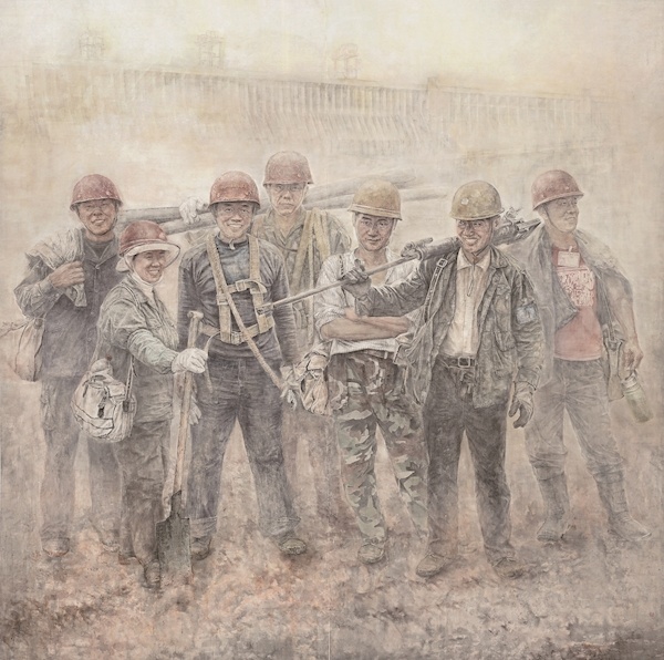 谢晓红《巍巍大坝的建设者们》 中国画 真实再现了大坝建设过程中的艰辛,描绘出工人们质朴、乐观的坚韧形象。