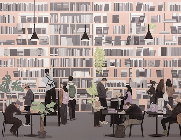 张俊怡 《城市书房》 油画 采用平面化的创作手法,营造出一个温馨与舒适的阅读场景,为读者设立一个心灵栖息的港湾。