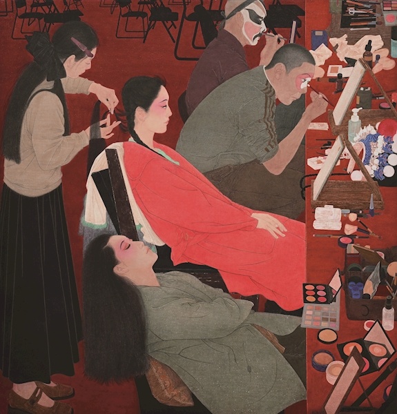 叶聪 《豆蔻年华》 中国画 随意摆放的化妆道具加强了场景的生活感,高低错落的人物安排强调了动静的对比。