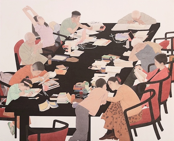 叶聪 《社区的阅览室》 中国画 将日常学习场景融入画面中,不同年龄、身份的人物各安一隅,以小场景折射大主题。
