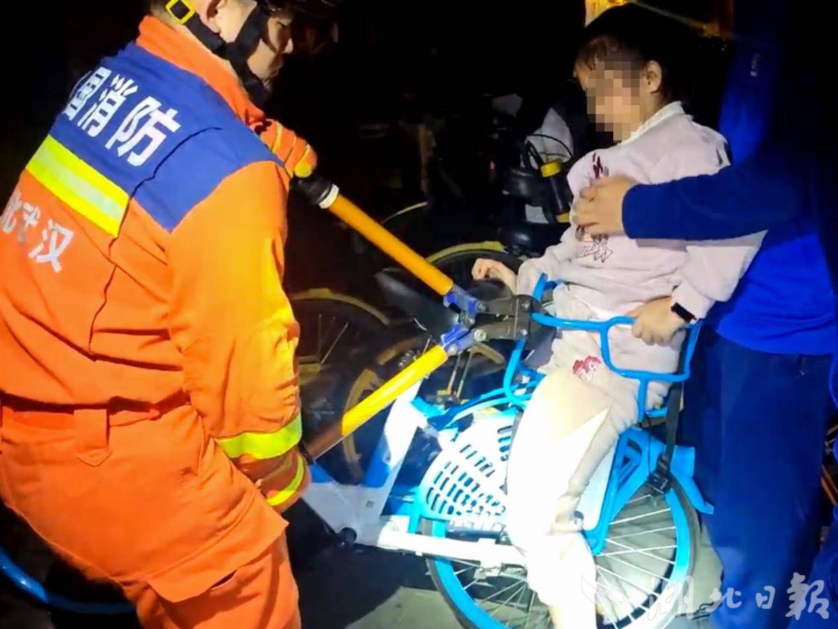 湖北日报讯(记者张竞恒、通讯员汉消)本想骑着亲子共享单车惬意游览东湖风光,不料8岁女儿的大腿却被车后座椅死死卡住,让张女士一家的周末之旅陷入困境。10月26日傍晚,这惊心一幕就发生在武汉市东湖绿道。接到报警后,武汉市消防救援指挥中心迅速调派华侨城站,出动1辆消防车和5名消防员赶赴现场处置。