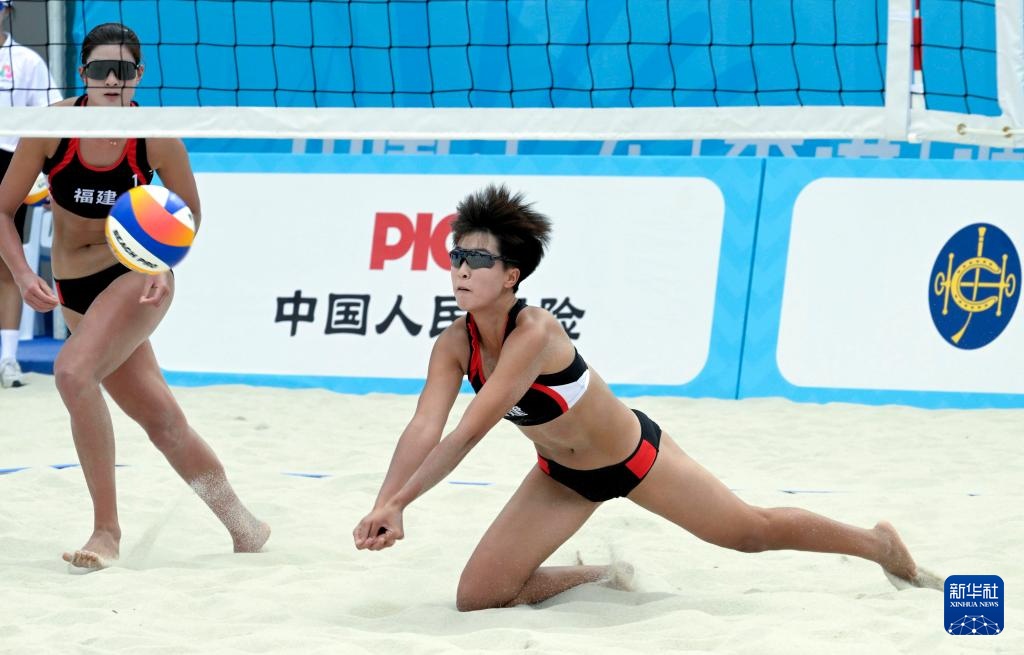 11月1日,新疆一队球员夏欣怡在女子小组赛A组比赛中救球。最终,新疆一队组合王婧哲/夏欣怡2比0战胜福建二队组合陈集涵/陈莹珊。