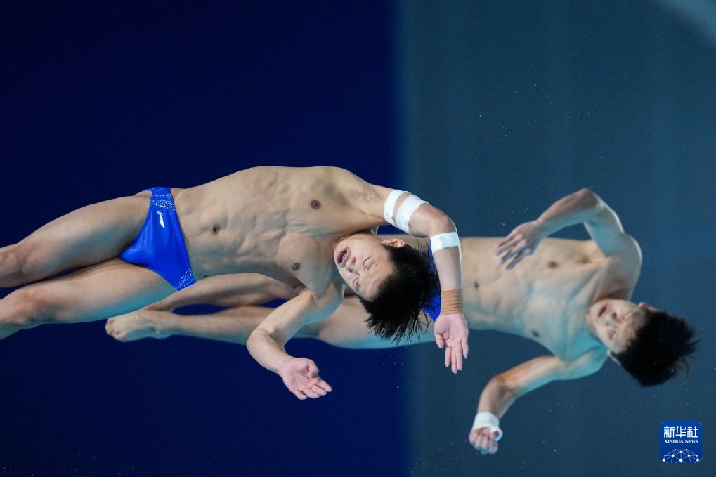 11月3日,湖北队组合辜煜恒/张家卿在男子双人10米跳台比赛中。