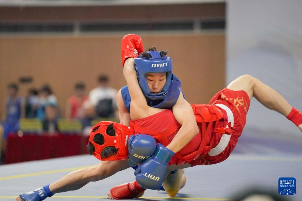 11月3日,青海师范大学武术散打队选手王鑫鹏(左)和乐山职业技术学院选手尕让泽仁在男子丙A组54公斤级比赛中。