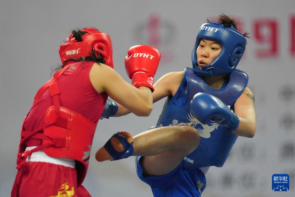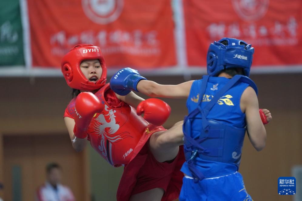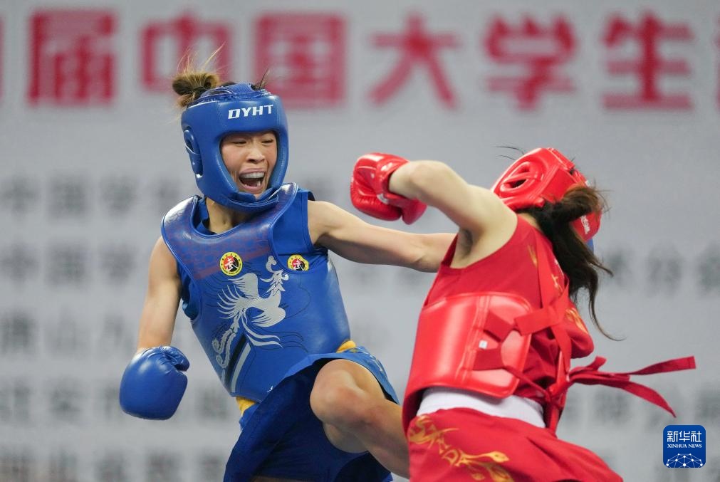 11月3日,北京体育大学武术散打队选手柳婉婷和河南体育学院散打队选手臧佳慧(左)在女子丁组52公斤级比赛中。